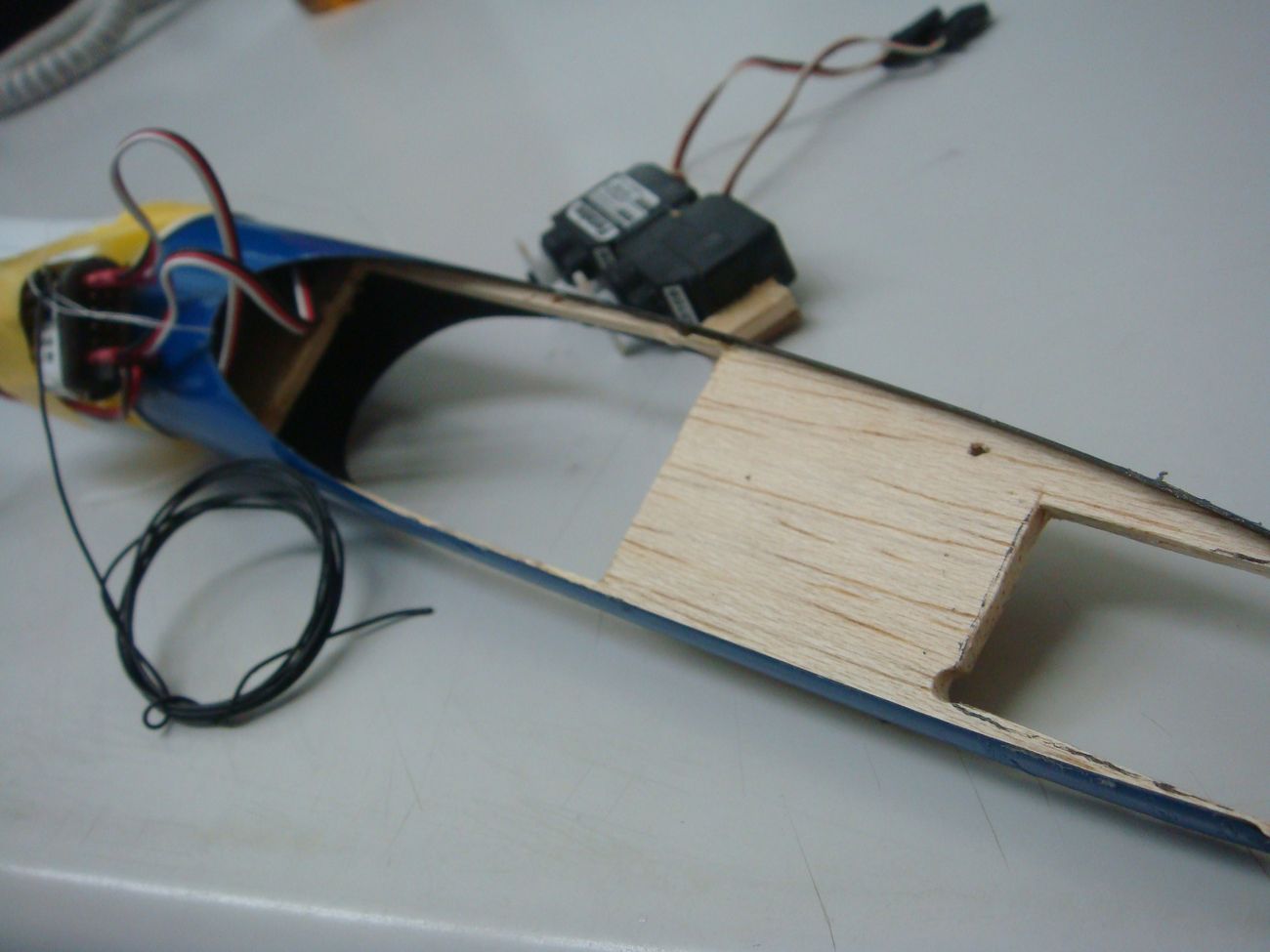 ついでにラダーサーボ以外を20g台のミニサーボに交換。(なるべくトルクのあるヤツをチョイス。現在は50g近い標準サーボ)